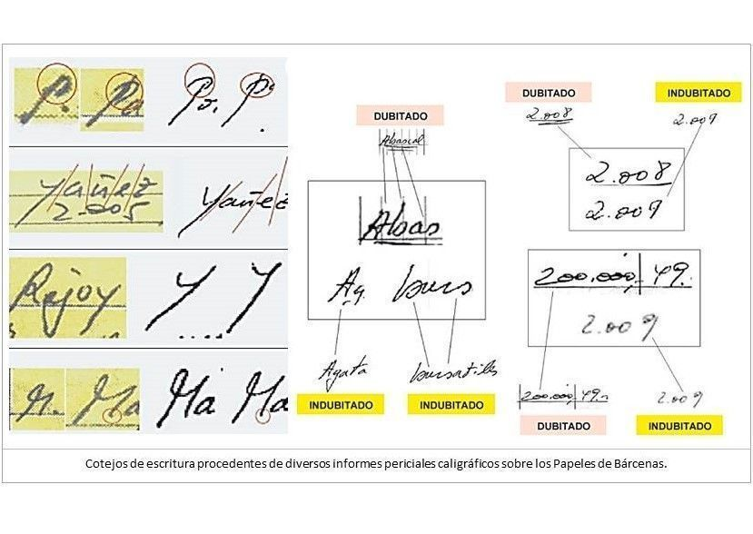 “Los Papeles de Bárcenas” son catorce folios manuscritos, realizados entre 1990 y 2008, con apuntes contables atribuidos a la mano del que fuera gerente y tesorero del Partido Popular, además de senador, José Luis Bárcenas. Estos documentos daban cuenta de una presunta contabilidad B, donaciones ilegales de empresarios con los que se pagaban gastos diversos del PP y sobresueldos en dinero negro a altos cargos del partido. El 18 de enero de 2013, el periódico El Mundo adelantó la noticia de los sobresueldos, pero la polémica estalla el 31 de enero con la publicación por el País de los Papeles de Bárcenas, en concreto de las fotocopias. Se citaba a varios cargos del Partido Popular como perceptores de los sobresueldos, entre ellos a María Dolores de Cospedal, secretaria general del partido, la cual, al entender vulnerado su derecho al honor, presentó el 18 de febrero de 2013 ante los juzgados de Toledo, ciudad en la que reside, una demanda civil contra Luis Bárcenas y El País, correspondiendo la causa al Juzgado de Primera Instancia e Instrucción Nº 4 de dicha localidad. En realidad, los papeles de Bárcenas no eran más que una derivada del caso Gürtel, una trama de corrupción relacionada con el Partido Popular de España, PP, denunciada por la Fiscalía en febrero de 2009 ante la Audiencia Nacional, y que al día de hoy continúa dirimiéndose en los tribunales. La toma del cuerpo de escritura se prolongó algo más de una hora y durante su desarrollo Bárcenas intentó disimular su propia letra. La forzó resultando una escritura lenta y artificiosa, y omitió la realización de varios números. En el informe pericial se puso de relieve que la letra estampada por el compareciente al dictado de los expertos y con la que rellenó cinco folios, no era la suya normal, extremo que dificultó el desarrollo de la prueba caligráfica, de manera que los resultados solo podían ser estimativos, no determinantes. La finalidad de esta prueba era cotejar la letra de Bárcenas con las anotaciones contables, por lo que el juez, atendiendo al informe policial que dejaba entrever la conveniencia de que Bárcenas volviera a someterse a esta prueba, ordenó repetir la diligencia, que se llevó a cabo el 22 de marzo de 2013 y su resultado fue remitido al Juez el 18 de abril de 2013, concluyéndose que: “las grafías y guarismos que se recogen en los papeles, publicados el pasado 31 de enero por EL PAÍS, han sido realizados por Luis Bárcenas Gutiérrez”.
