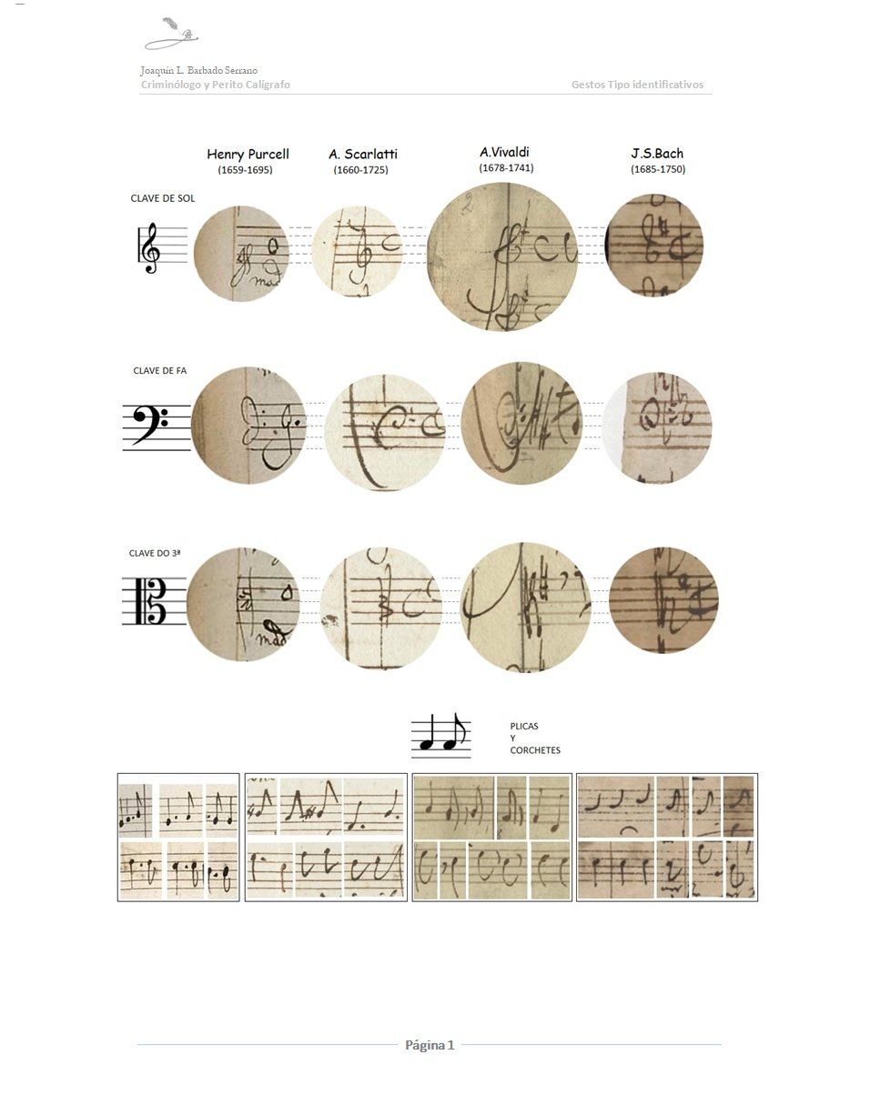 INTRODUCCIÓN: GRAFÍAS EN PARTITURAS MANUSCRITAS. (introducción del trabajo de investigación) La escritura es un gesto y como todos los gestos que realizamos en nuestro comportamiento cotidiano, está compuesto por factores conscientes y otros inconscientes. Los primeros son voluntarios, tenemos conciencia de ellos, queremos escribir y escribimos a través del ejercicio motor consistente en coger el útil con los dedos pulgar e índice apoyamos sobre el anular, mientras el pequeño meñique nos marca la dirección reptando suavemente por el papel. Los segundos son involuntarios, por lo tanto inconscientes que dan lugar a otros gestos de enorme valor cualitativo y signaléctico. Este movimiento gestual que aprendemos en la infancia se personaliza a medida que crecemos y maduramos, de factores inconscientes y espontáneos, que nos van alejando del modelo aprendido y van dotando a nuestra escritura de una personalidad genuina, original y exclusiva. El Documento manuscrito es la muestra donde se afana el perito Caligráfico, en él se manifiesta la impronta del grafismo del escribiente, tanto en su vertiente estructural como dinámica (forma y movimiento). En su ardua labor de investigación y cotejo de muestras dudosas versus auténticas, analiza un inmenso elenco de parámetros grafonómicos: orden espacial, forma, ambiente gráfico, dimensiones, presión, dirección, cohesión, inclinación, velocidad y cadencia, caja renglón, espontaneidad, sinceridad, factores endógenos, factores exógenos, y un largo etc., de todos ellos el elemento de mayor relevancia identificativa es el que llamamos “gesto tipo”: trazos personalizados en la escritura, que son inconscientes y genuinos de cada persona haciéndola única e irrepetible”. La “clave” en notación musical es un signo cuya función es indicar la altura de la música escrita, asignando a una línea del pentagrama una nota concreta, punto de referencia para establecer el nombre del resto de las notas. Los tres símbolos actuales utilizados son clave de Do, clave de Fa y clave de Sol, siendo el resultado de la evolución histórica de tres signos representados respectivamente por la letra “C”, “F” y “G”, que más adelante desarrollaré su evolución histórica dentro de la nomenclatura occidental. De todas las grafías musicales existentes (figuras, silencios, signos de repetición, alteraciones, matices, ligaduras de expresión, ligaduras de prolongación, líneas divisorias, líneas adicionales, etc..) las “claves” son las más complejas en cuanto a su trazado, dimensiones, forma, orientación, situación, arranque y desenlace; por tanto más difícil de plasmar y de imitar, lo que me lleva a determinar, que: La “Clave” en la partitura manuscrita equivale a la “firma” de un documento. ¿Qué quiero decir con esto? Quiero decir, que la firma cuanto más completa y compleja sea más facilita la labor del perito para identificar a su autor; pues lo mismo ocurre con la “Clave” musical, su dibujo y trazado es por sí misma compleja, lo que aumenta las posibilidades de identificar a su copista o mano autora. En éste trabajo de investigación mostraré un exhaustivo catálogo comparativo de “Claves musicales” de los principales compositores de la música Barroca y Clásica, adjuntando en su caso firmas y otros “gestos tipo” relevantes. Como curiosidad significar que en aquellos tiempos el útil de escritura habitual era la pluma, cuyo análisis grafonómico varía considerablemente del actual, ya que la simple inclinación del ángulo de la plumilla varía el calibre del trazado y entintado. Este estudio tiene por objeto identificar de forma categórica al compositor escribiente del manuscrito musical, o bien descartarlo e identificar a su copista.